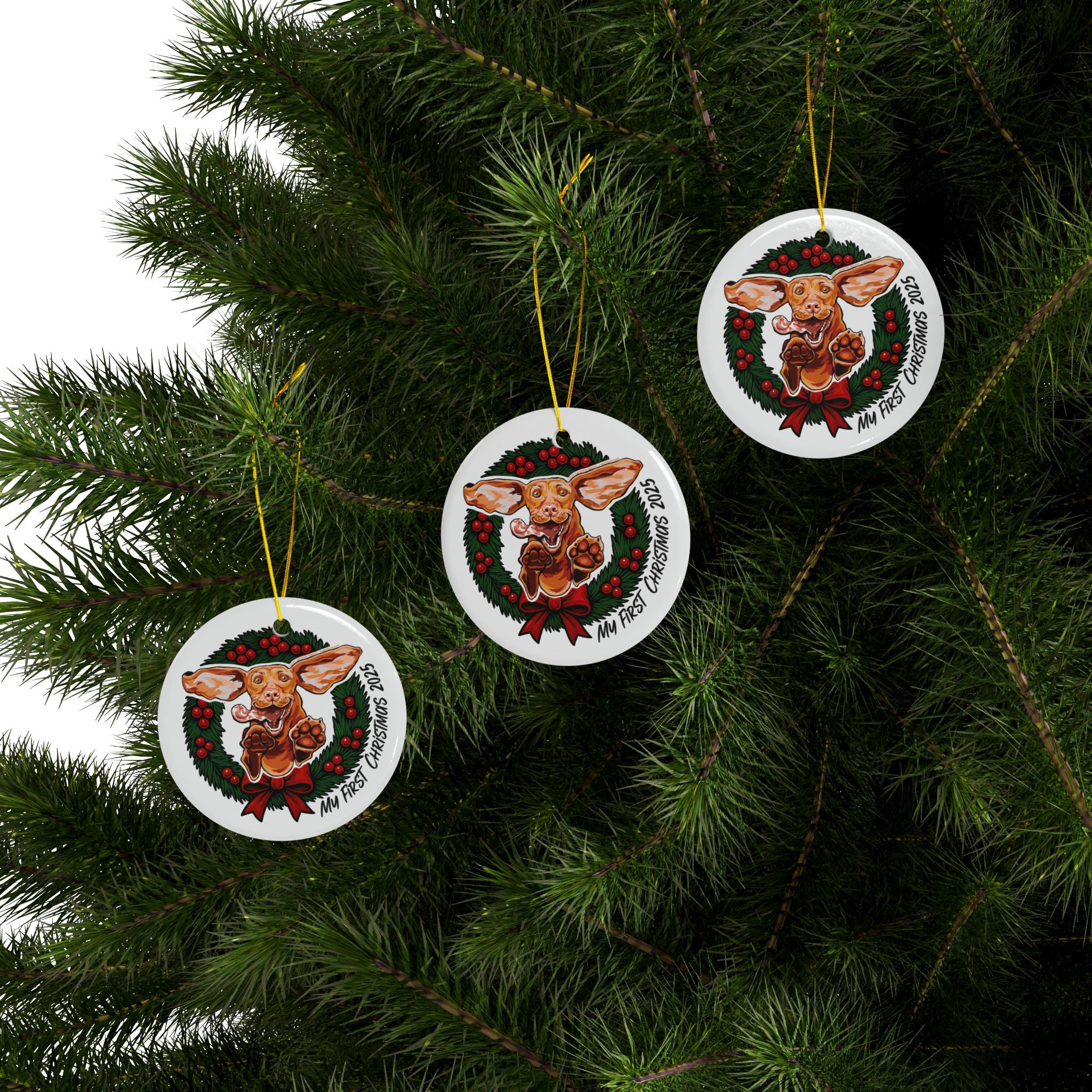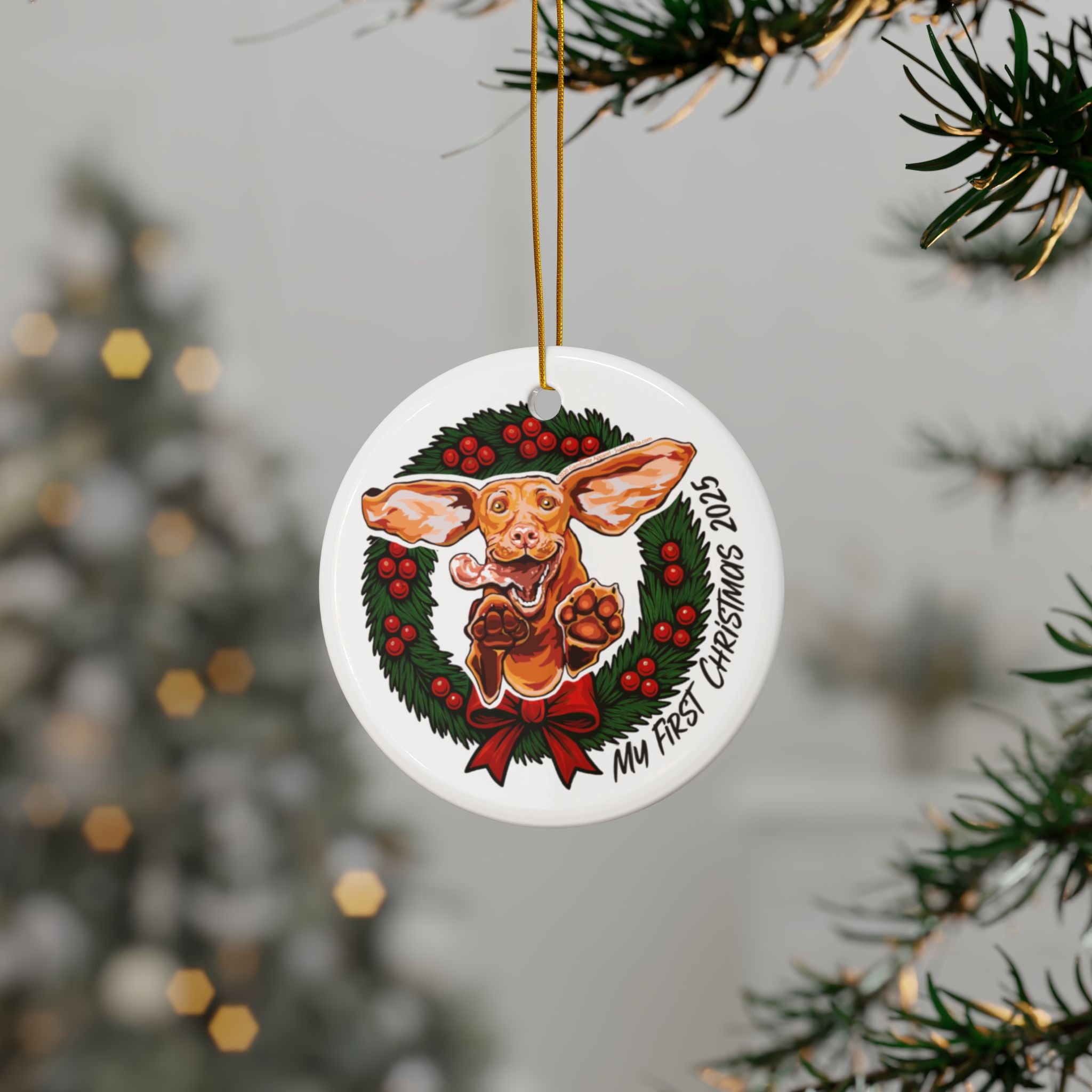 Ceramic Ornament - "My First Christmas 2025" Puppy Wreath Holiday Keepsake