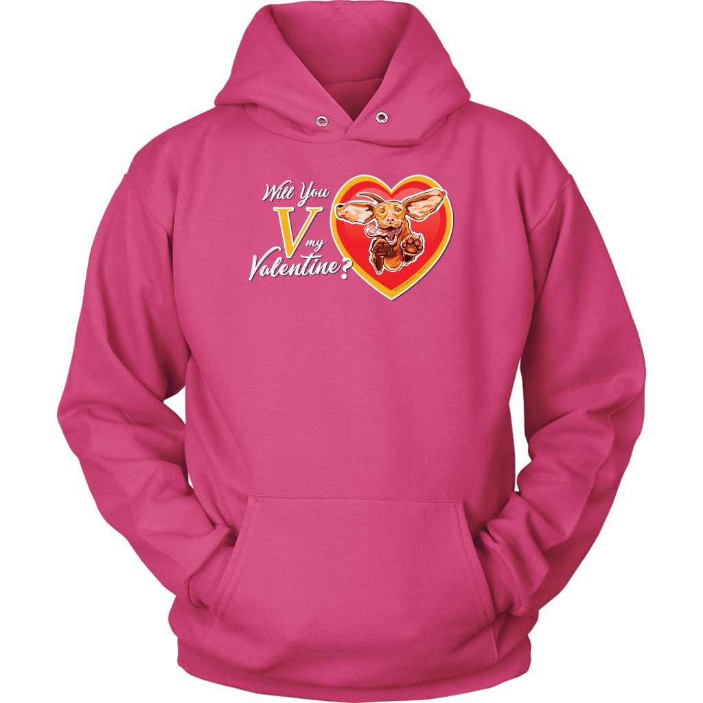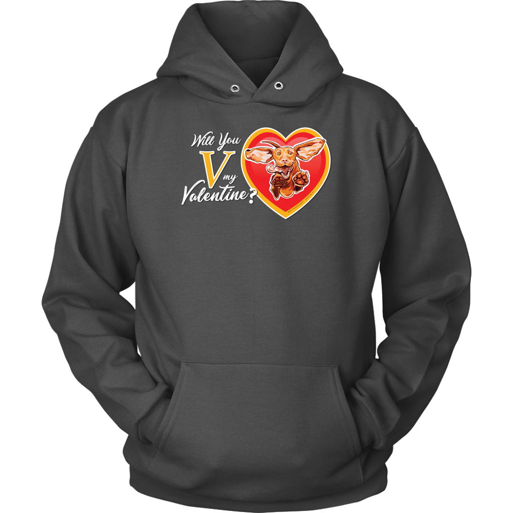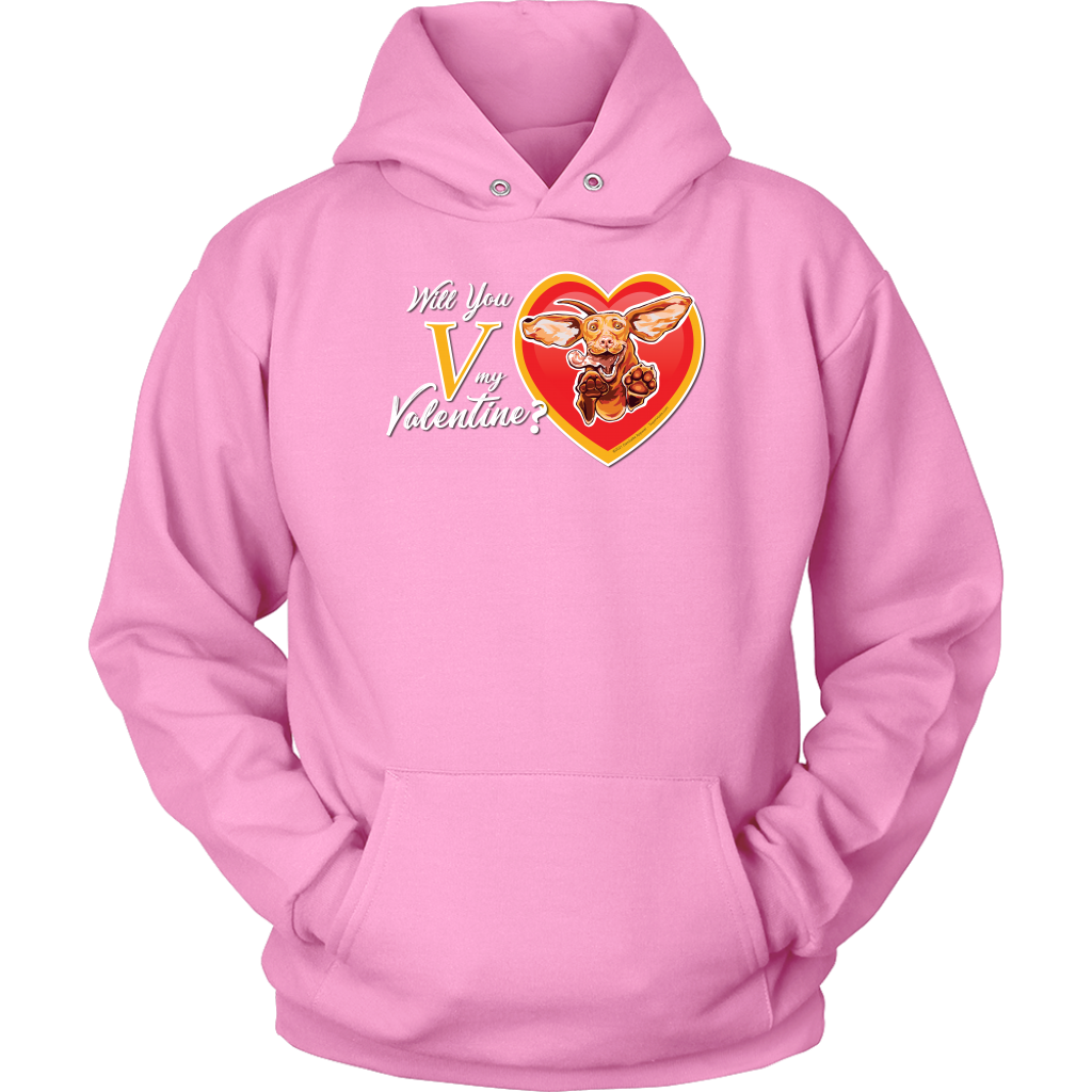 An incredibly soft and comfortable Unisex Hoodie featuring the "Will You V My Valentine?" design by Super Vizsla