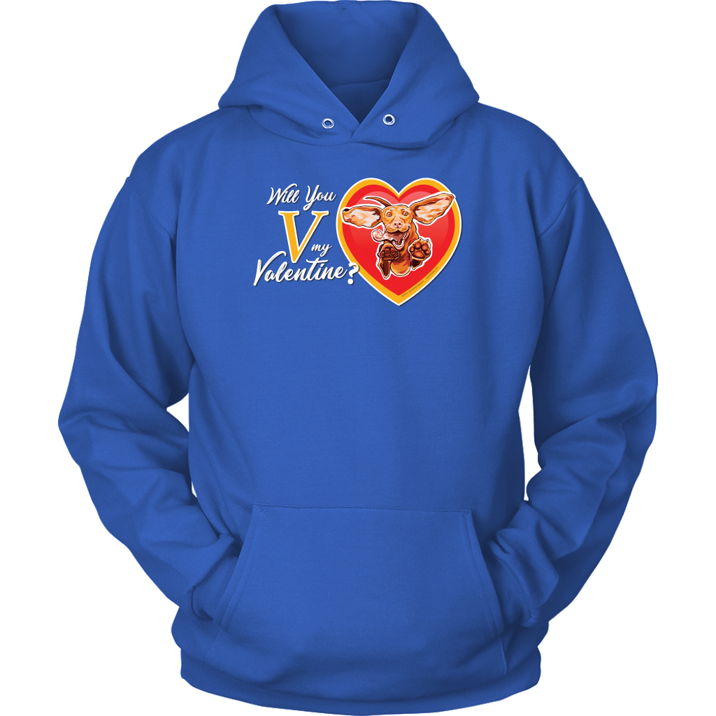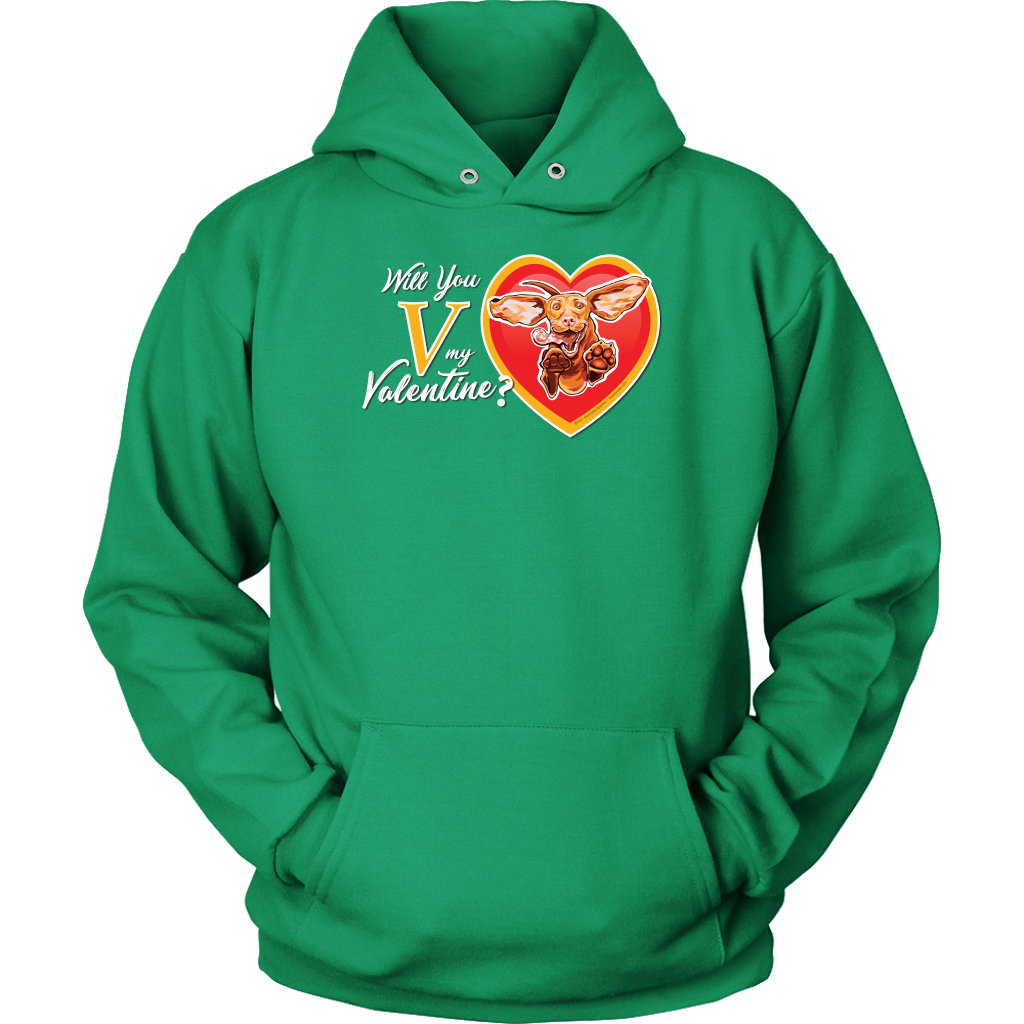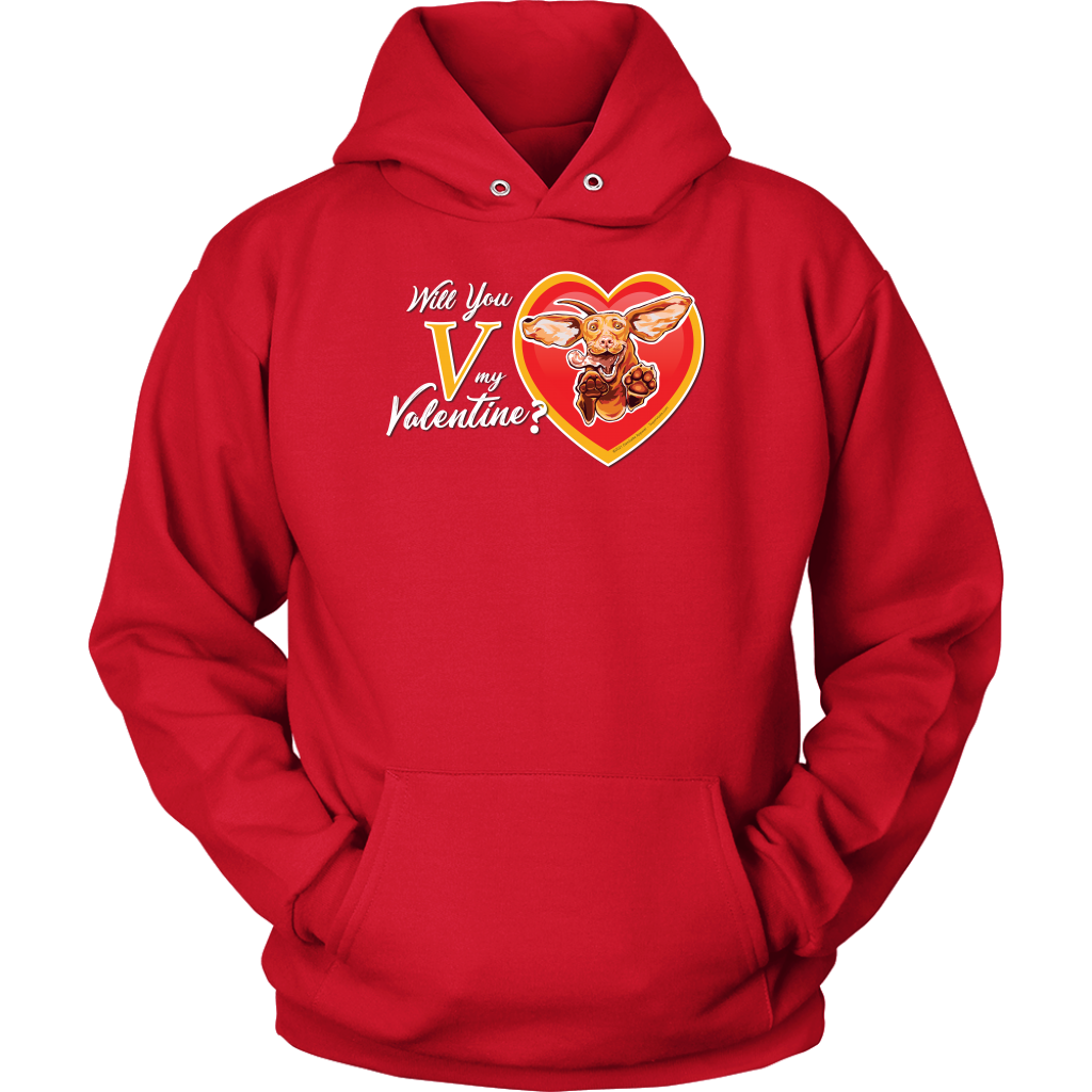 An incredibly soft and comfortable Unisex Hoodie featuring the "Will You V My Valentine?" design by Super Vizsla